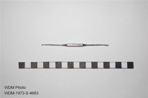 This ear curette has a bent hook on one end and a small oval spoon on the other. This piece of medical equipment is used to remove ear wax and other debris from the patient’s ear. WDM-1973-S-4683