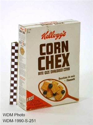 This box of Kellogg’s Corn Chex cereal features an image of a large spoon containing the cereal, blueberries and milk. WDM-1990-S-251