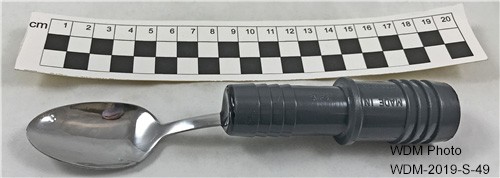 This metal spoon has been modified to have a larger plastic handle. Utensils are easily modified to allow for independence for those who may have face fine motor skill challenges. WDM-2019-S-49.6.e