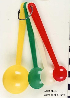 Measuring spoons have become a staple in any kitchen. These ones are plastic, and each measurement is a different colour (Yellow - 1 tablespoon, Green - 1 teaspoon, White - 1/2 teaspoon and red - 1/4 teaspoon). These ones were likely received through a promotion from Blue Ribbon Manufacturing Company, which is best known for their baking powder and tea. WDM-1995-S-1346