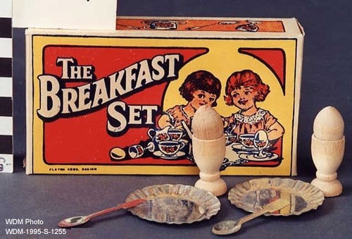 Spoons have always been a plaything for children from banging on pots and pans to having tea parties. The WDM has a toy breakfast set that consists of small metal plates, metal spoons, wooden eggs and wooden egg cups. Judging by the image on the box, this was only part of a larger collection of kitchen playthings. Toys like this were made in part to help prepare a young girl for her often-assumed role as a housewife in the early 20th century. WDM-1995-S-1255.9.A-I
