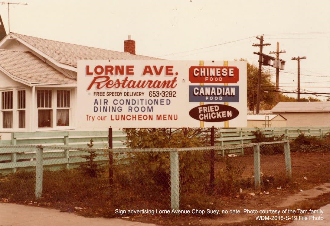 Tom Yee opened Lorne Avenue Chop Suey on the northeast corner of Taylor Street and Lorne Avenue in 1968. The restaurant served both Western and Chinese style food. They were especially well known for their TJ Tasty Fried Chicken and their homemade egg rolls. The fried chicken was breaded and seasoned with a mix of herbs and spices and sold in buckets. The egg rolls were made with crepe-thin wrappers of egg and filled with chopped vegetables and a special sauce, then dipped in batter and deep fried. Tom Yee’s daughter describes the food served at the restaurant as “Canadianized Chinese food” as well as Western-style food like fish and chips, hamburgers and steak.
