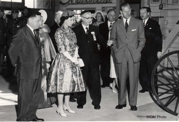 | On July 22, 1959, Her Majesty Queen Elizabeth II and her late husband His Royal Highness Prince Philip, Duke of Edinburgh visited the WDM Saskatoon and Pion-Era and were given a tour by the WDM’s first curator, George Shepherd. This photo shows them at the old location of the WDM Saskatoon, at 11th Street West. | |