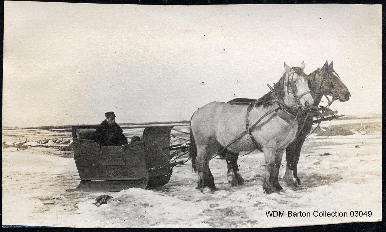 When there was snow on the ground that was difficult or impossible to traverse on wheels, sleighs like this were used to travel on top of the snow. No date.