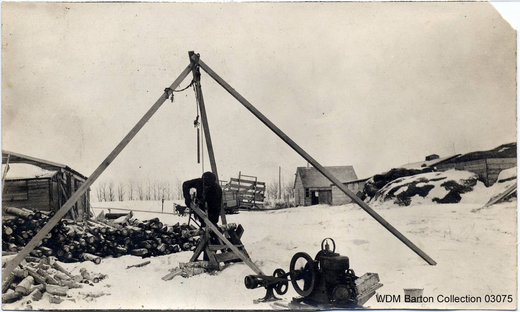 This photo from March 1920 shows someone using a gas engine to chop wood. The comments on the photo note that gas engines were very helpful and saved a lot of labour!