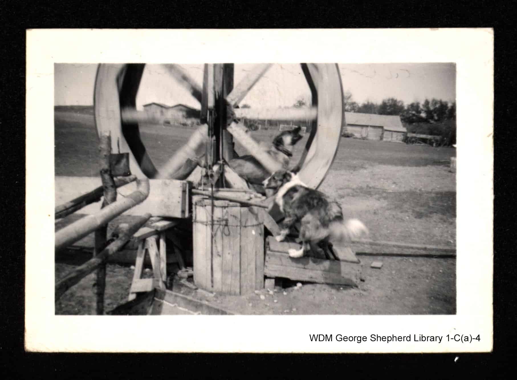 A dog running on a wheel, possibly pumping water, while another dog sits to the side, c. 1920.