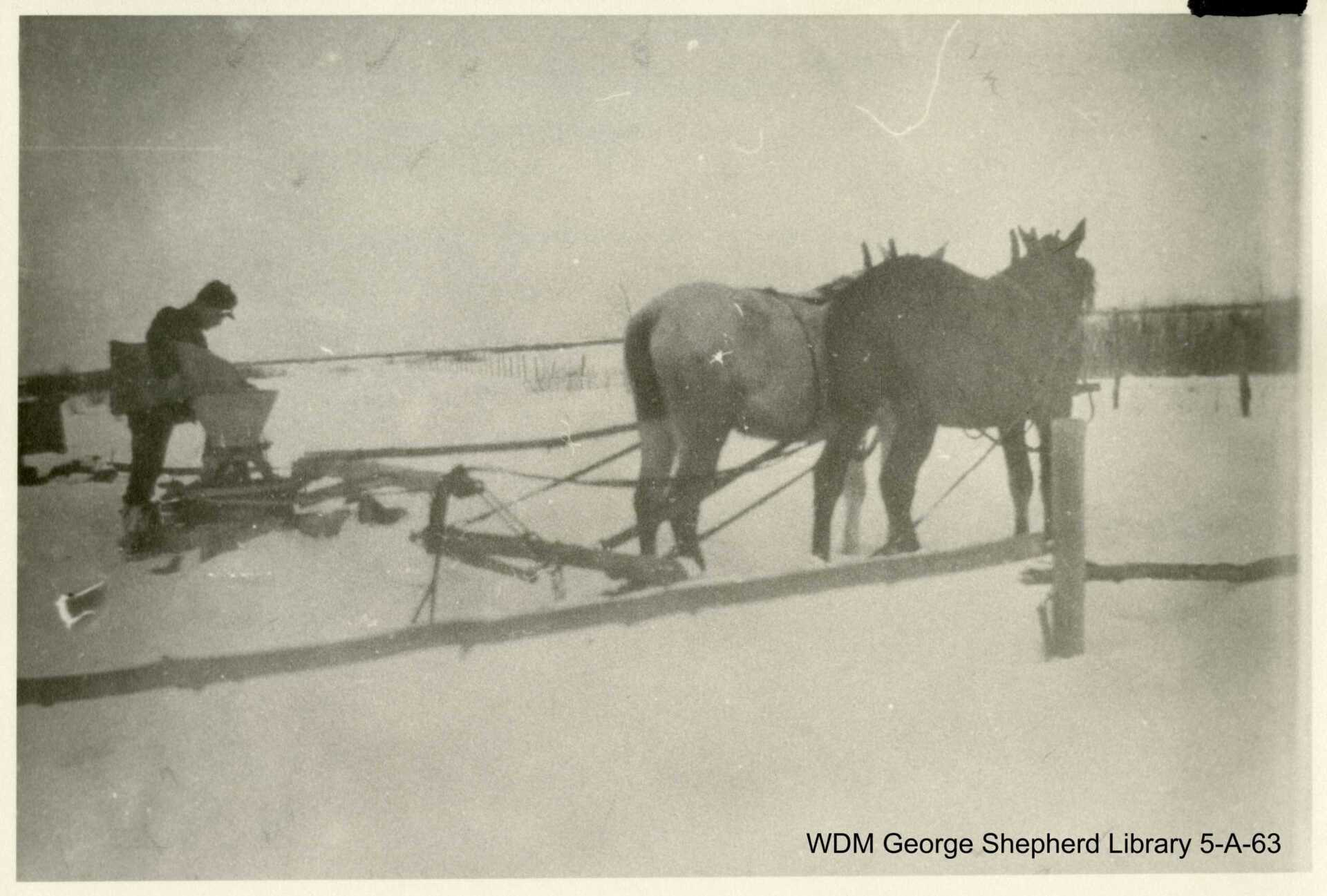 Grinding grain in winter with a horse-powered grinder. The person on the left is pouring grain into the grinder while the horses wait. No date.