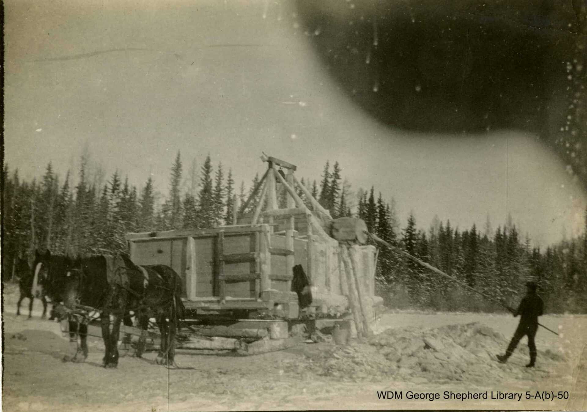 A team filling the water tank for sprinkling the ice road at Prince Albert. The team behind the tank are hauling on a rope, which passes through a pulley at the top of the tank to raise the barrel. The pole pushes the barrel down again after. No date.