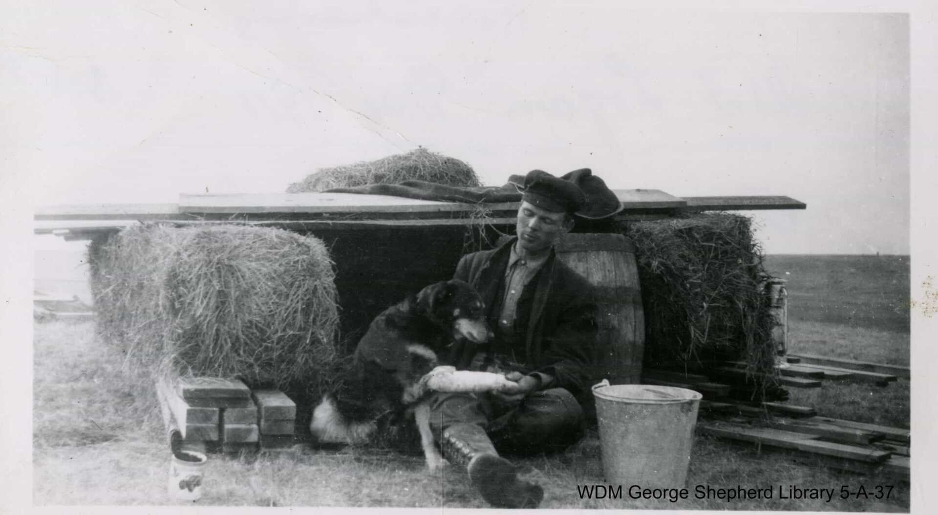 The caption on this photo reads “W. J. Logan, May 1911. First morning on the homestead near Beadle.” It shows a man and dog seated in front of a makeshift shelter made of hay bales, barrels, and wood planks.
