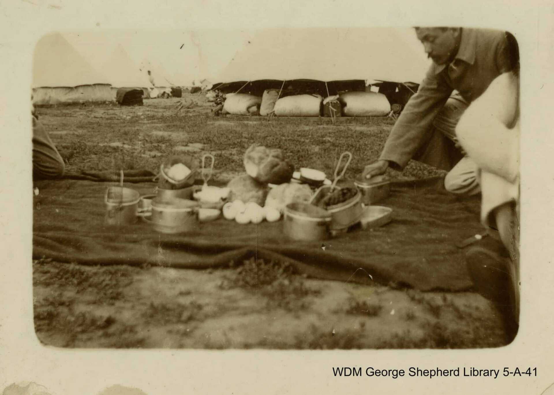 This photo shows food and supplies such as cooking pots spread out on a blanket. In the background are numerous white tents. This likely shows the Barr Colonists somewhere along their journey to what is now Lloydminster in 1903, though there is no date noted on the photo.