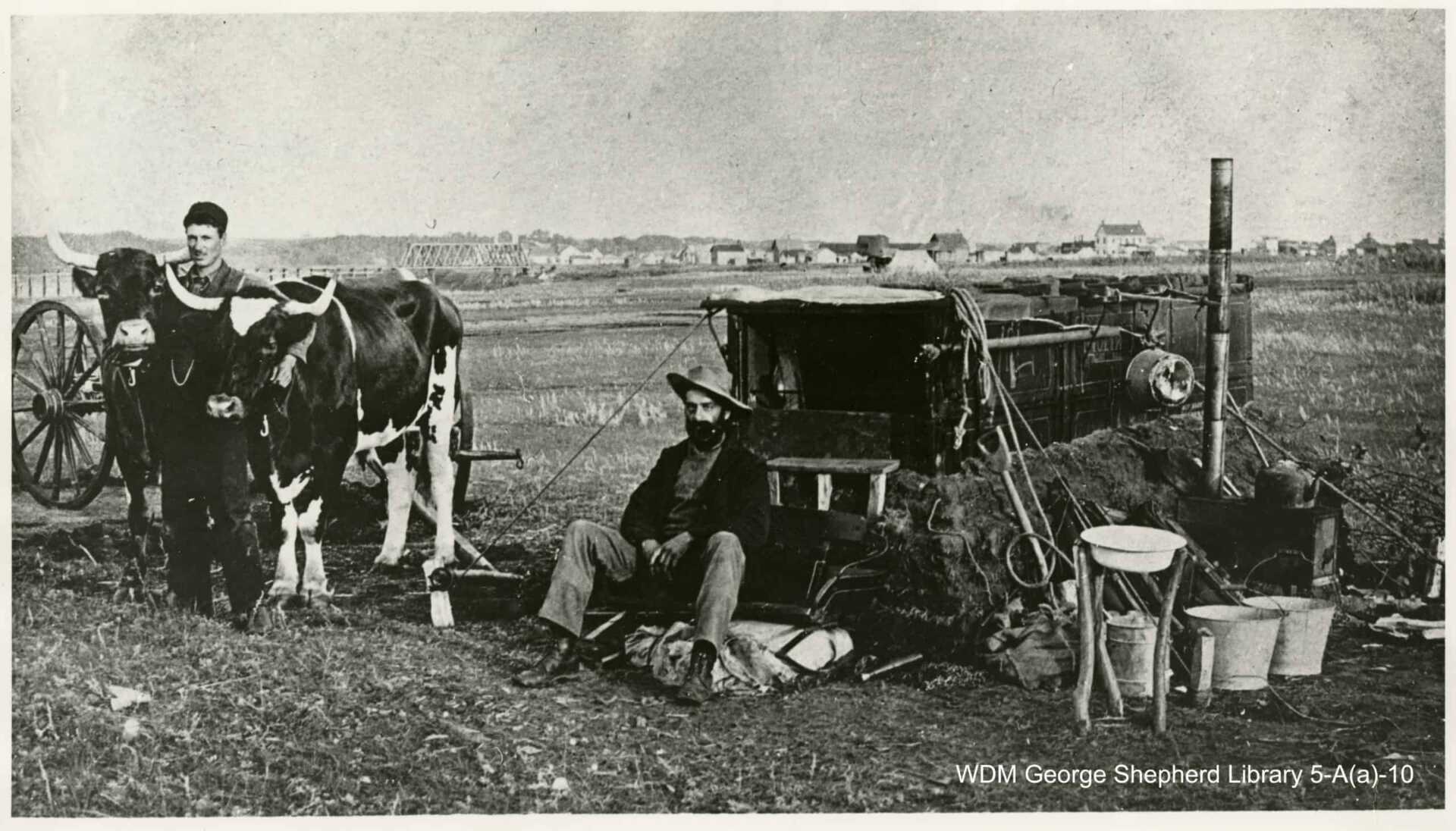 This 1903 photo shows two men in what became the village of Riversdale in 1905. They turned a wagon box upside down for shelter until they could build a more permanent structure. In 1906, Riversdale joined the towns of Saskatoon and Nutana to form the City of Saskatoon.